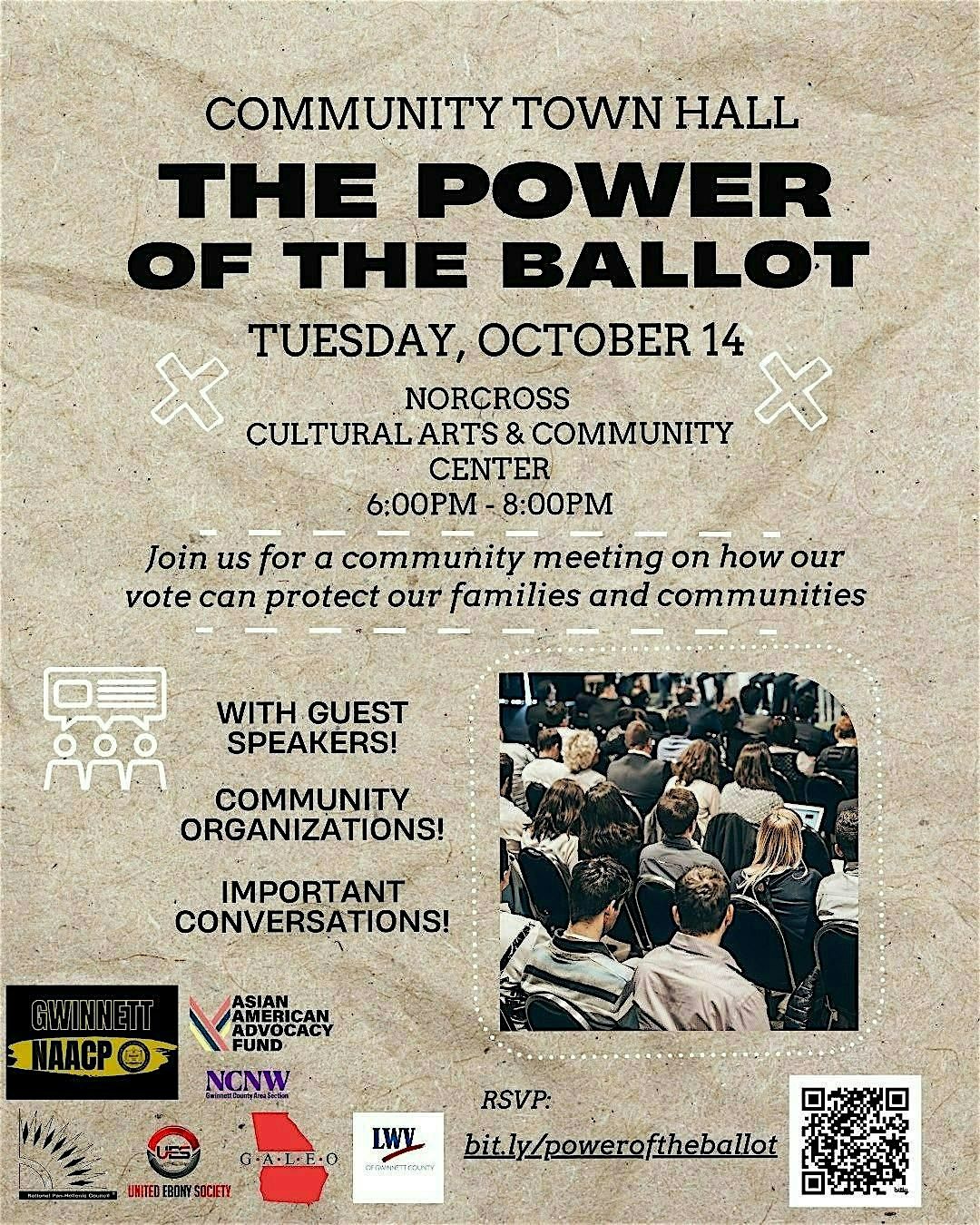 Come join us for an eye-opening event at the Norcross Cultural Arts & Community Center where we will explore the impact of your vote. Learn about the history of voting rights, the importance of civic engagement, and how your ballot can make a difference. This in-person event will feature guest speakers, interactive discussions, and opportunities to get involved in your community. Don't miss out on this chance to discover the power of the ballot!