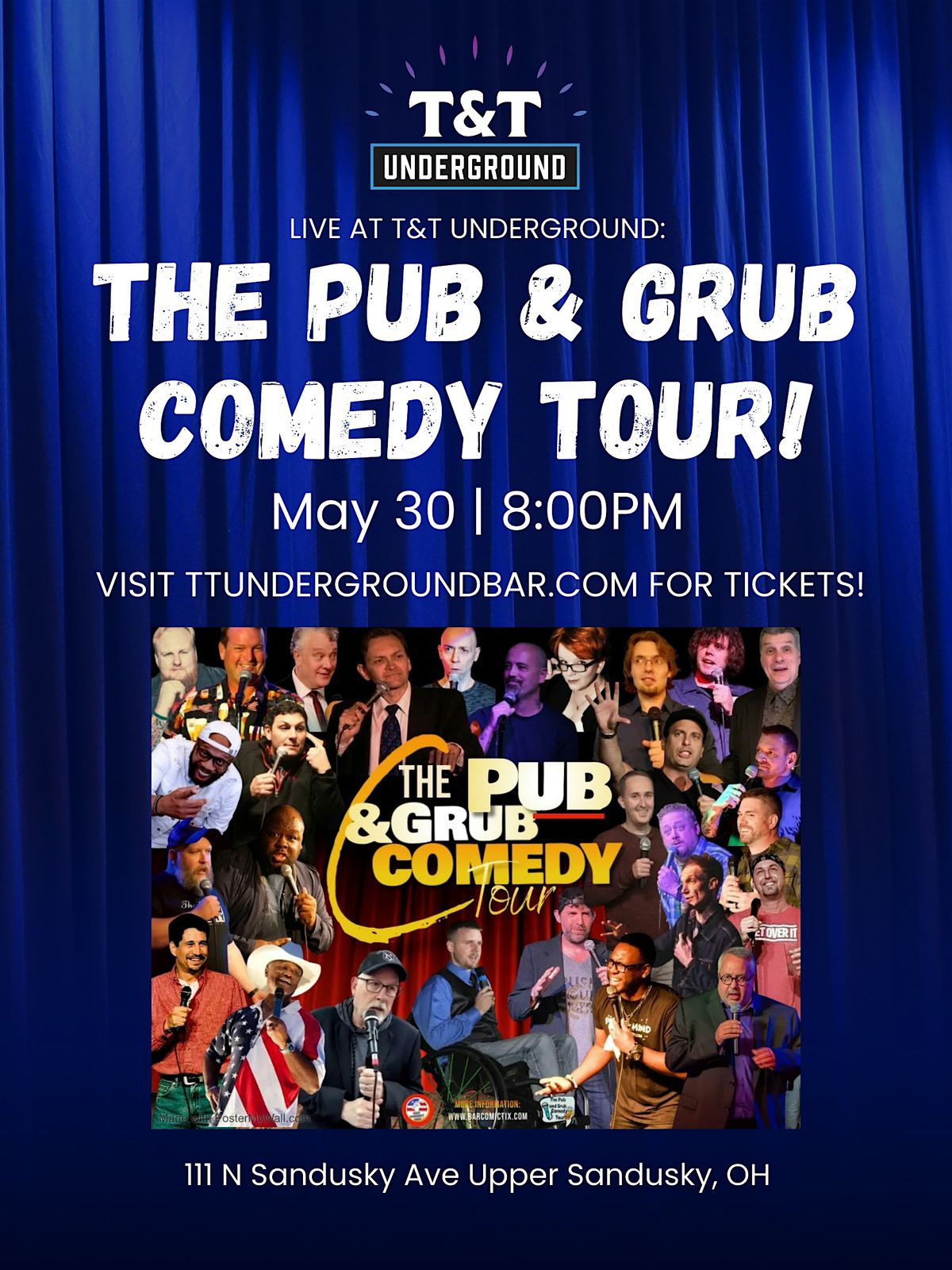 Tell your friends, grab your seats, and come experience an unforgettable night of comedy at The Pub & Grub Comedy Tour—live at T&T Underground in Upper Sandusky, Ohio!