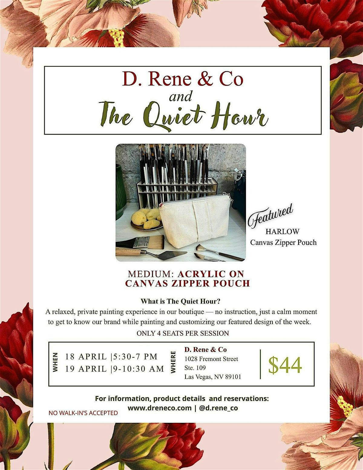 Unwind and paint at your own pace. A quiet, no-pressure experience featuring our Harlow canvas pouch and light refreshments.