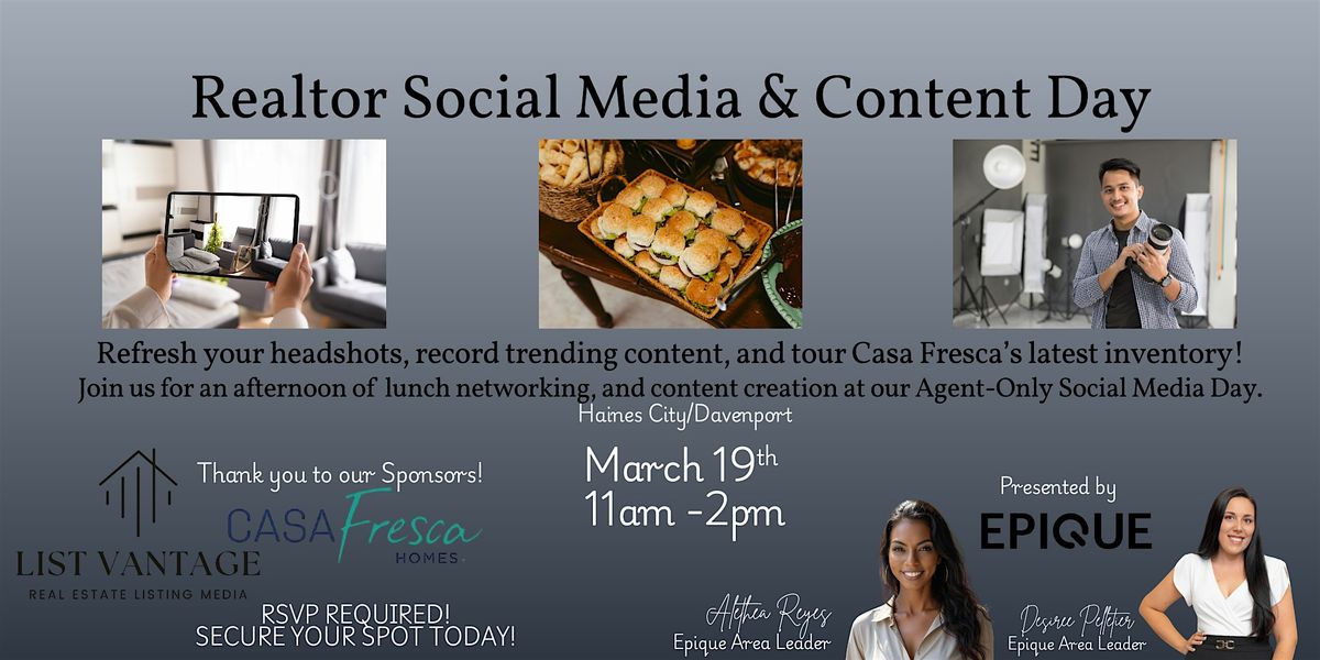 Stop scrolling and start creating! Epique Realty invites you to a high-energy Social Media Day designed for agents who want to network, grab a great lunch, and batch some high-quality content in a stunning environment.