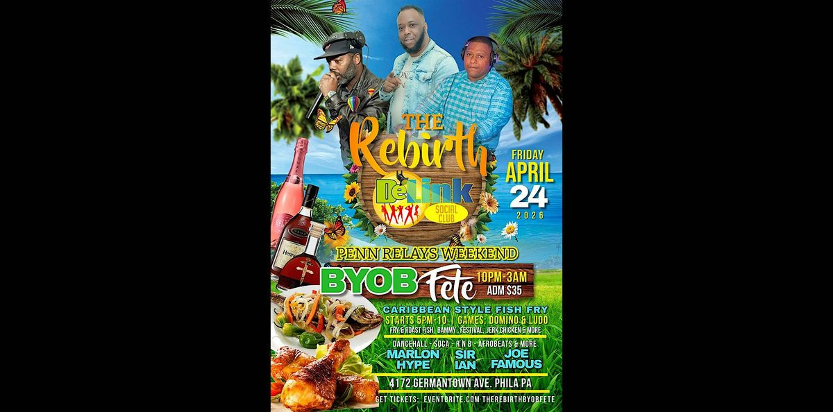Get ready to vibe in person at The Rebirth BYOB Fete! THE ULTIMATE PENN RELAYS WEEKEND BASHMENT. Bring your own drinks and join us for a night full of good energy, great people, seasoned to the bone Caribbean cuisine. Come jump to the beats of Dancehall, Soca, R n B, Afrobeats and make unforgettable memories. It's all about chillin', dancing, and celebrating life together. Don’t miss out on the fun—this is the spot to be!