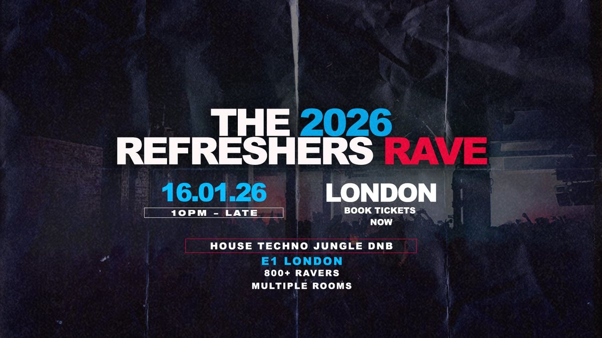 The 2026 Refreshers Rave at E1 LDNFriday 16th JanuaryTickets are online now!It's time to say hello to a brand new calendar year, which means one thing for students of London - REFRESHERS! And in turn, the Refreshers Rave is here. One huge party to see in January and leave the holiday blues behind. Lets get to it.This event has been previous held at Fabric, XOYO And Ministry of Sound, & EGG LDN, but this year we're taking the Refreshers Rave to E1 LONDON once again! That's right, join us across multiple rooms to kick off the new year!After the huge demand this term so far, we expect this Party to sell out in advance.
