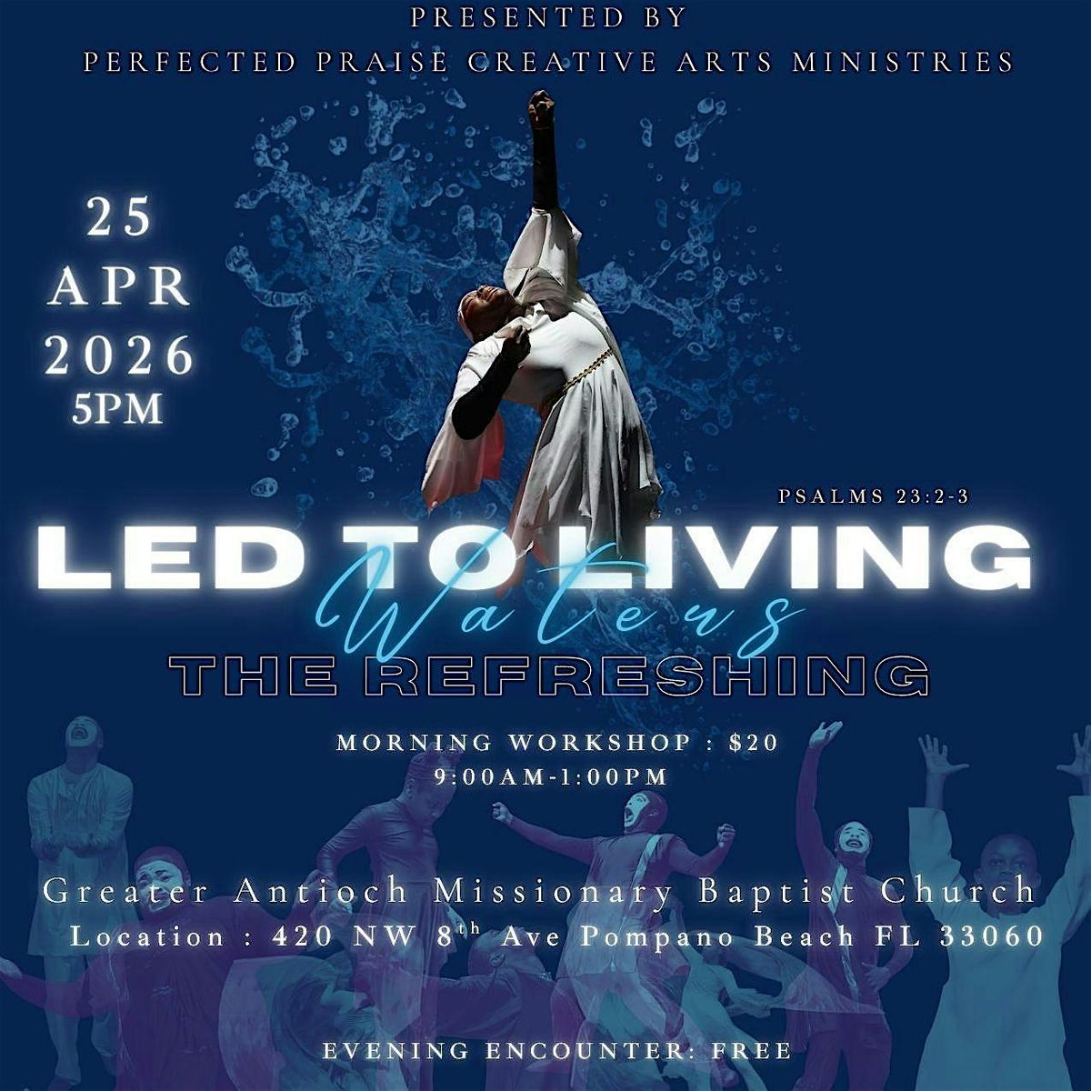 From 8:00 AM to 1:00 PM, we will host a hands-on workshop led by three anointed and powerful facilitators who have a heart for both movement and ministry. During this time, they will teach choreography step by step for a piece that will be ministered later in the evening. Along with learning the dance, you will also receive guidance, encouragement, and spiritual insight to help you grow both physically and spiritually.