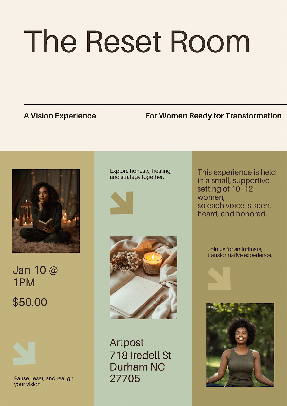 Welcome to The Reset Room! Join us at 718 Iredell St on January 10, 2026 at 1:00 PM (Eastern Time) for a day of relaxation and rejuvenation. Take a break from the hustle and bustle of life and immerse yourself in a calming atmosphere. Leave your worries at the door and step into a space designed to help you reset and recharge. We can't wait to see you there!