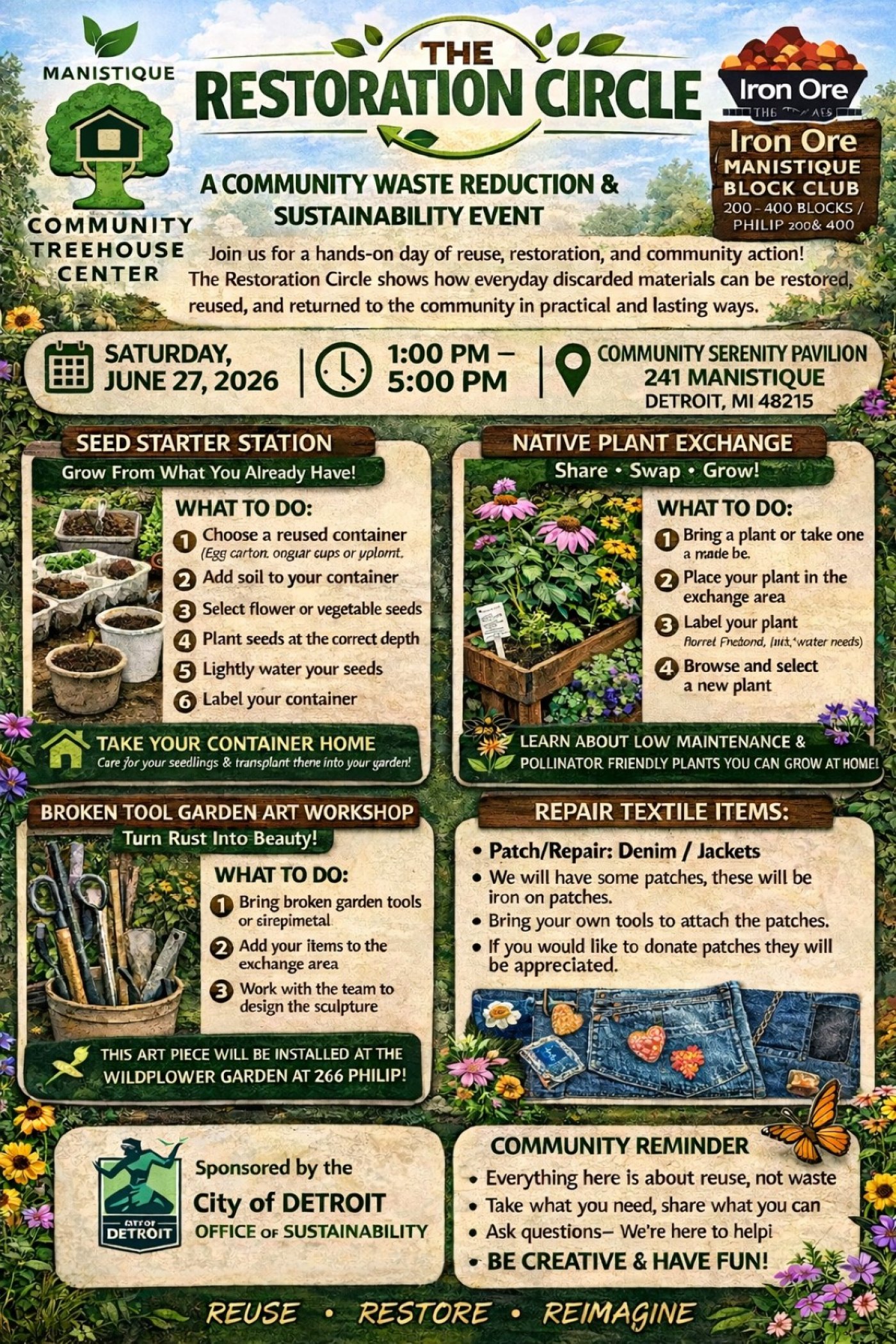 The Restoration Circle is a one-day outdoor event where residents reuse materials, plant seeds, exchange plants, and create art from broken tools. This hands-on experience reduces waste, promotes sustainability, and strengthens community connections.