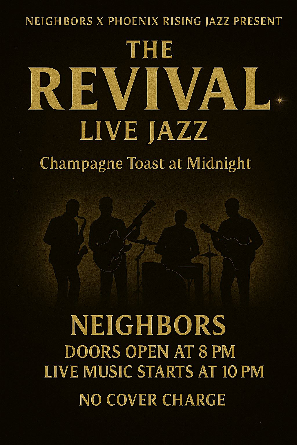 The Revival is a celebration of music, culture, and community — featuring a live jazz called Phoenix Rising Jazz, curated vibes, and a complimentary champagne toast at midnight to bring everyone together.
