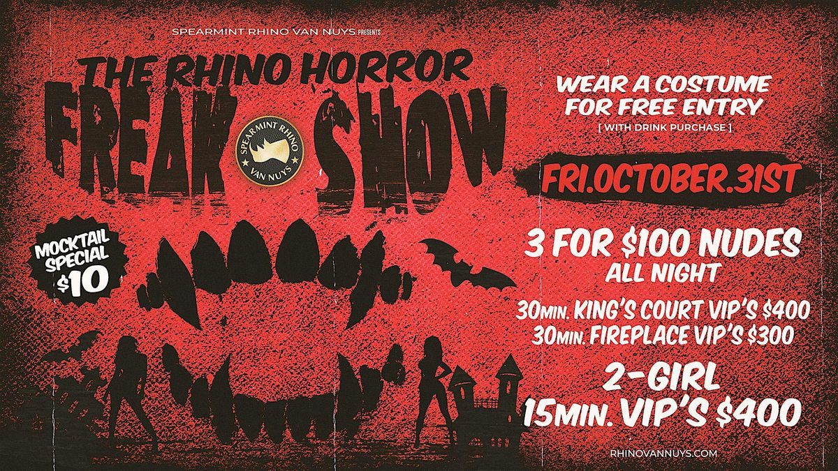 Join us for The Rhino Horror Freak Show β a night of spooky thrills, wild fun, and hauntingly good specials at Spearmint Rhino Van Nuys.