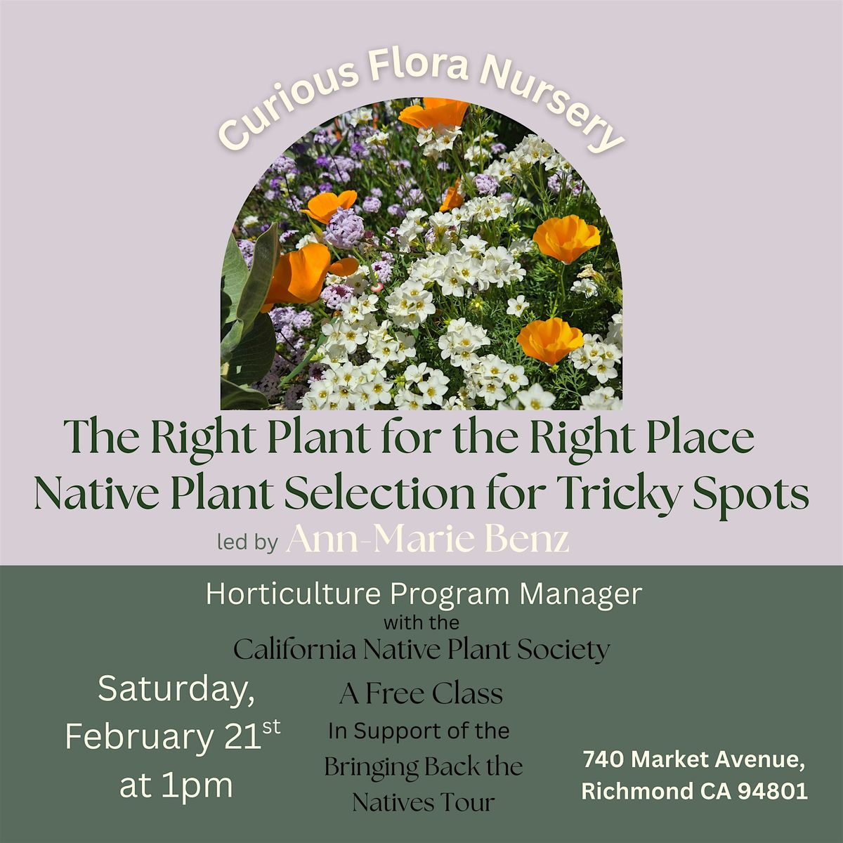 Join us for a free talk and stock up on early bloomers for your very own California native super bloom this spring! Ann-Marie will be in the nursery to talk about what your natives need now, and how you can get the most out of our rainy season without feeling flooded.