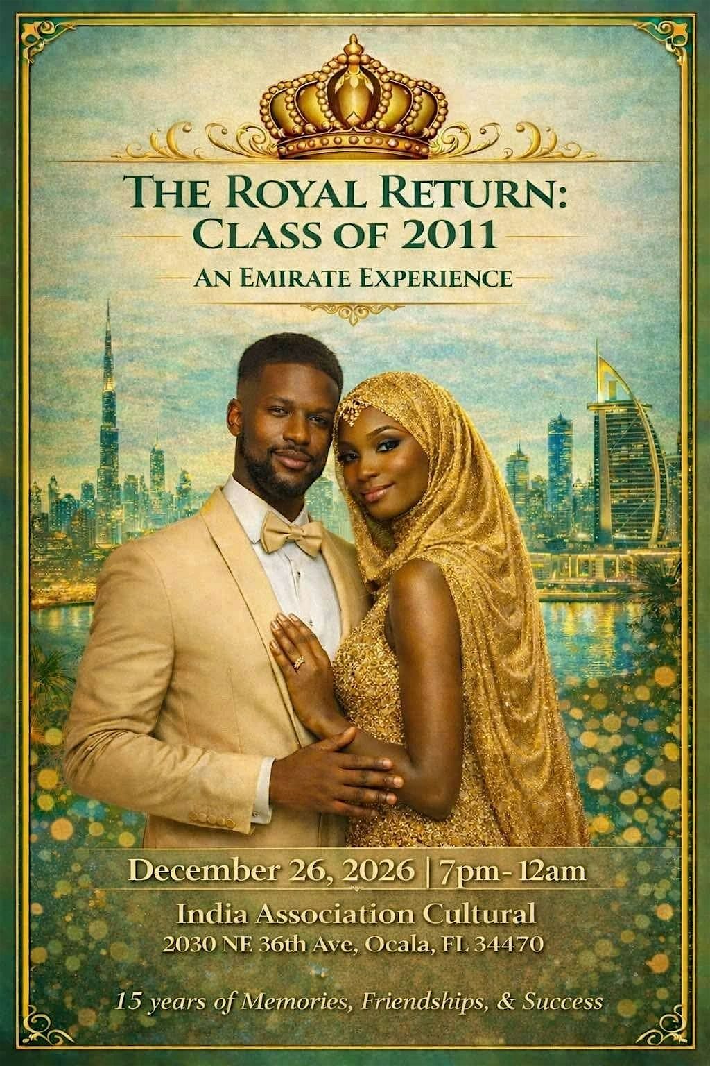 The Royal Return: Class of 2011 – An Emirate Experience is a signature celebration honoring the 15-year reunion of Marion County’s Class of 2011. This unforgettable evening brings classmates back together in a refined, high-energy atmosphere inspired by elegance, culture, and connection.