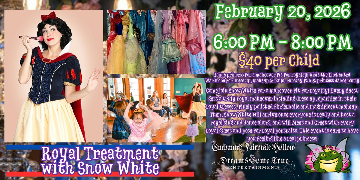 Come join Snow White for a makeover fit for royalty! Every guest gets a truly royal makeover including dress up, sparkles in their royal tresses, finely polished fingernails and magnificent makeup. Then, Snow White will arrive once everyone is ready and host a royal sing and dance along, and will Meet and Greet with every royal guest and pose for royal portraits. This event is sure to have you feeling like a real princess!