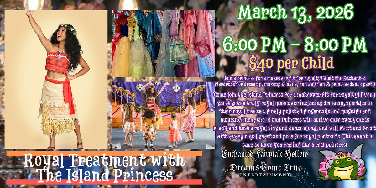 Come join the Island Princess for a makeover fit for royalty! Every guest gets a truly royal makeover including dress up, sparkles in their royal tresses, finely polished fingernails and magnificent makeup. Then, the Island Princess will arrive once everyone is ready and host a royal sing and dance along, and will Meet and Greet with every royal guest and pose for royal portraits. This event is sure to have you feeling like a real princess!