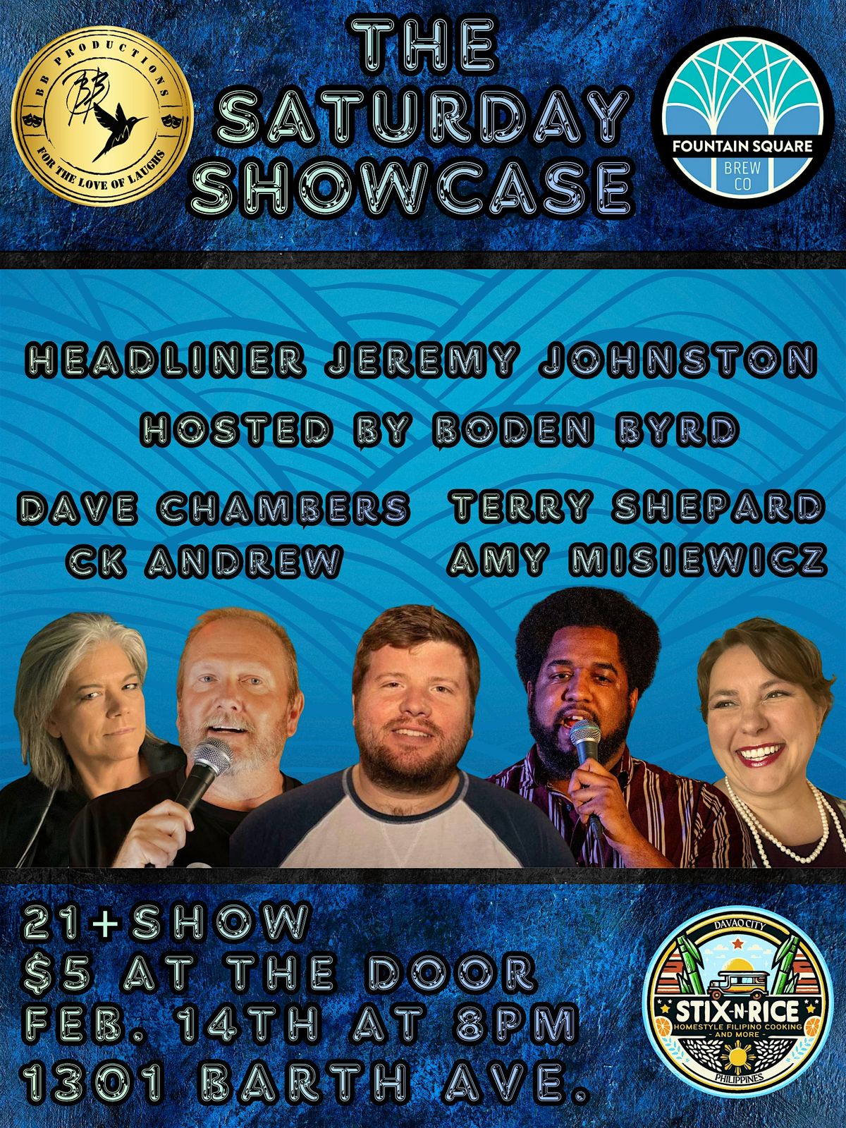 Headliner Jeremy Johnston finishes out the night along with this brilliant new lineup of comics at FSB. BB Productions has put in the work to bring the hilarious talents of Amy Misiewicz, Dave Chambers, CK Andrew, and Terry Shepard, with your host Boden Byrd.