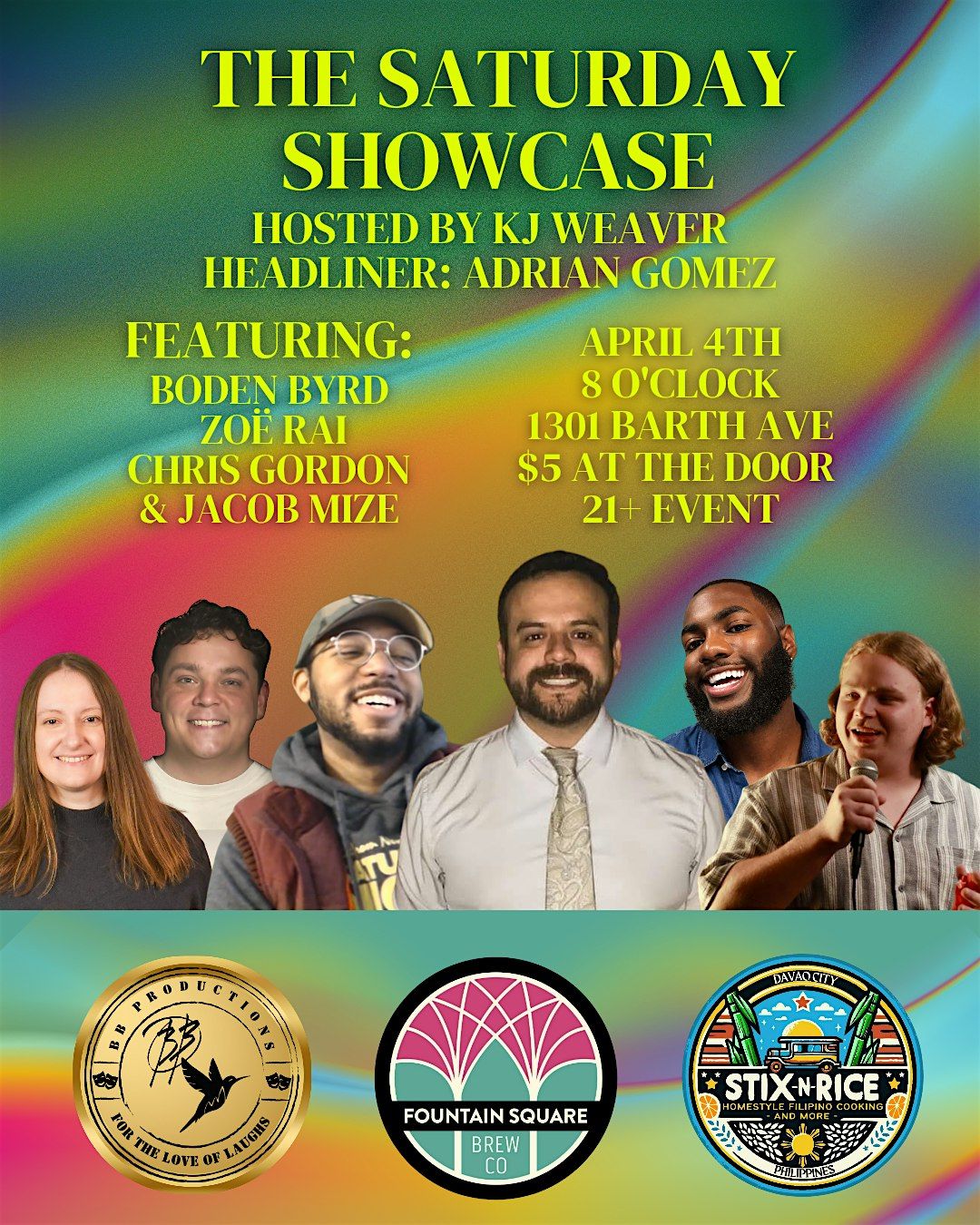 The Saturday Showcase returns to FSB this april to spotlight the up and coming comedians of the indianapolis area, come on out for great brews, an awesome Phillipino food truck, and roaring laughter from our headliner, Adrian Gomez, and the host with the most, KJ Weaver!