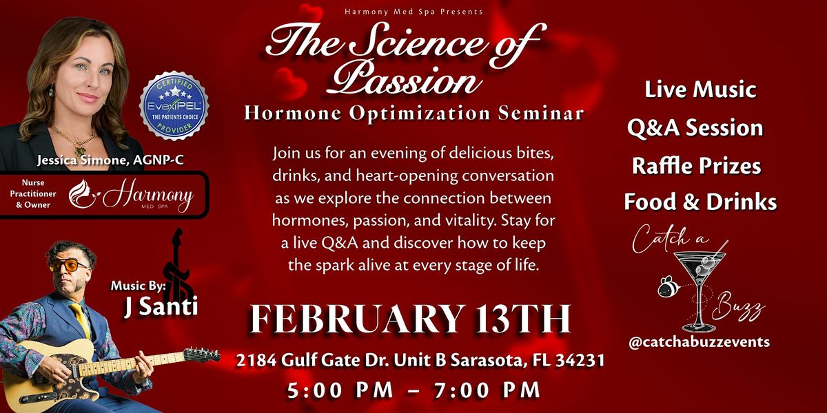 Set the mood with live music by local artist J Santi from 5–6 PM as you mingle and enjoy complimentary signature cocktails, wine, and mocktails provided by @catchabuzzevents mobile bar. Through the Evexipel system approach, discover how optimizing your hormones can help keep the spark alive—inside and out.