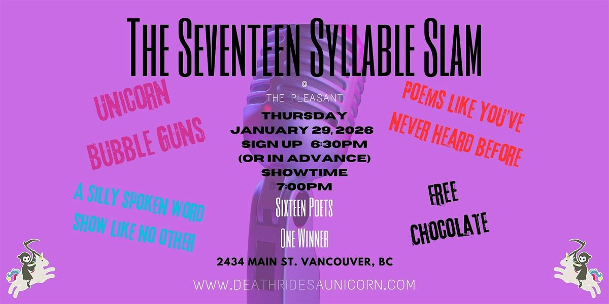 The Seventeen Syllable Slam is a literary comedy poetry competition where poets attempt to win over judges with their short poems. Each poem needs to have seventeen syllables or less (sort of like a Haiku) and there will be 16 poets in the competition, with the top four taking home cash prizes. The poems do not have to be funny, but the event certainly will be. Please expect a unicorn, bubbles, flags, and fur.