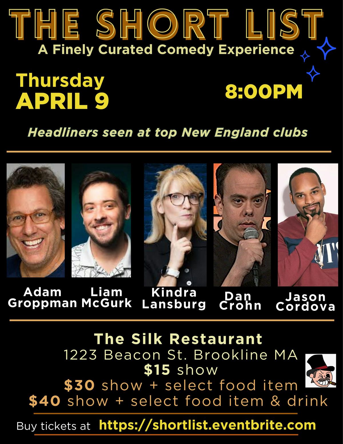 Located in the classy, beautiful nouvelle-Indian cuisine dining emporium The Silk, a few blocks from Brookline's Colidge Corner, this show brings a superb, high-quality comedy experience befitting the venue's atmosphere and menu.