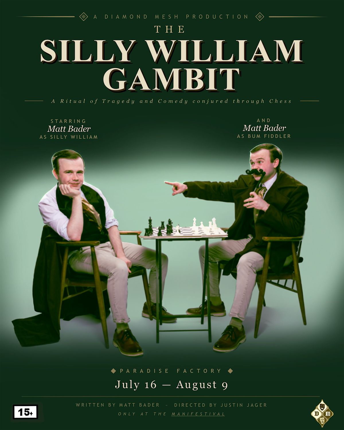 Eccentric chess prodigy Silly William finds himself on a train bound for hell (Or Philadelphia, as it is known in some circles,) and he finds himself seated across from a man named Bum Fiddler, who only plays the gimmickiest opening in all of chess: the Scholar’s Mate Attack. Bum Fiddler informs Silly William that at the end of this train ride, he is going to die, and that Bum Fiddler is going to K*ll him. But in the meantime, they are bored, and there is chess. So why not play? Fortunately for Silly William, he has spent his entire life specifically crafting a gambit to refute the Scholar’s Mate Attack, and he sees no better scenario in which one could fully deploy it. Over the course of this train ride, they play seven chess games. Silly William brings the games to life with move by move annotations that explain the thoughts in each player’s mind, as he teaches the audience how to play his gambit, whilst sprinkling in tales from his youth, waxing poetic, and sharing a pint or two of philosophy. The entire story takes place over the course of these seven games. And as the games progress, Silly William will come to find that the opponent sitting across from him is none other than Addiction itself; the Addiction which took the life of his best friend and the addiction that has come to grip him as well. Over time, the lines between the two players begin to blur, and Silly William will have to at last confront where a person stops and their addiction begins.