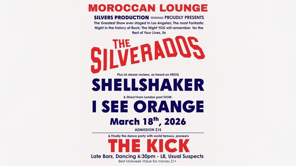 The Moroccan Lounge presents: The Silverados, Shellshaker, I See Orange & The Kick [March 18, 2026 / Doors 6:30pm / $15 adv / $15 dos / 21+]