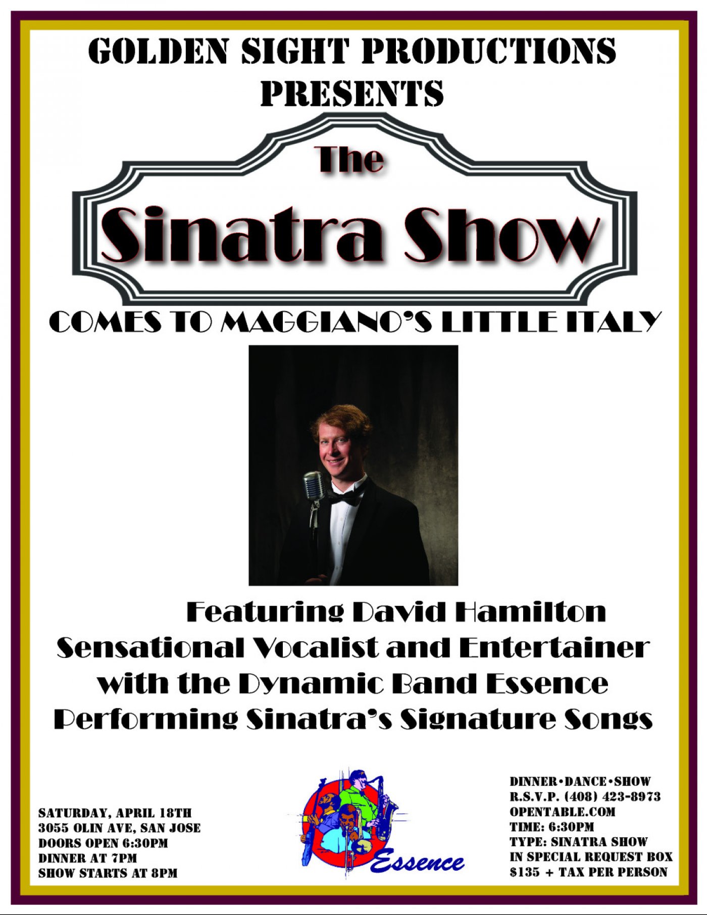 We invite you to have a sensory experience and engage in a high-octane show. Featuring David Hamilton, sensational vocalist, and the Dynamic Band Essence performing the signature songs of Sinatra and more.