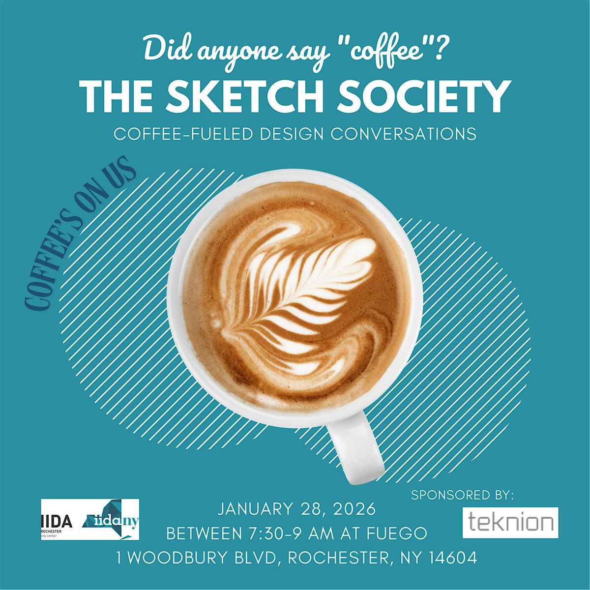 Our first monthly coffee Meet-up, a relaxed networking gathering for creative professionals and design students; will take place a Fuego Coffee Roasters. Thank you, Teknion, for being our sponsor this month! Each month we will pick a new local location. :)