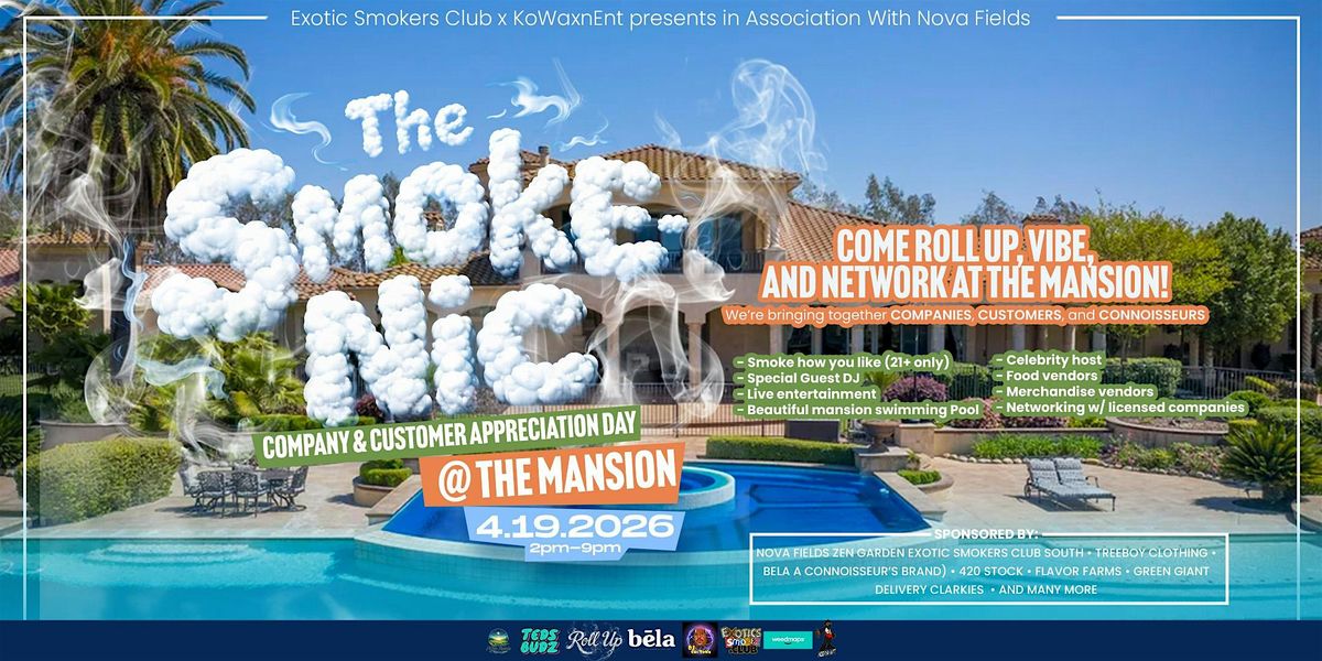 π¬οΈ Smoke how you like (21+ only) - Special Guest DJ - Live entertainment BβLegit - Beautiful mansion Pool party scenery - Celebrity host Alley Al presents - Food vendors -Merchandise vendors - π Networking with licensed compliance companies Sponsored by: Nova Fields Zen Garden Exotic Smokers Club South β’ Treeboy Clothing β’ bela (a connoisseurβs brand) β’ 420 Stock β’ Flavor Farms β’ Green Giant Delivery β’ and many more VENDORS & TABLE SERVICE - All merch vendors must be fully set up by 12:00 PM - Food vendors*and general admission*check Eventbrite - For vendor info, table service, VIP & bottle service: π Call: 510-470-8639 ποΈ Tickets & Info: Search Eventbrite: SmokeNic26 Mature 21+ only