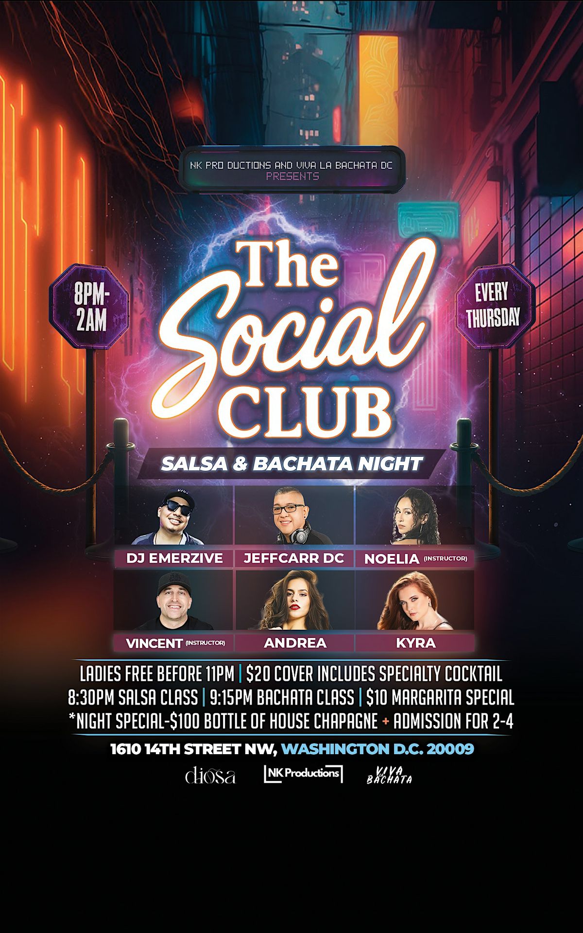 Step into The Social Club β an upscale Latin dance night hidden beneath a Mexican fusion restaurant in Washington D.C., where Salsa and Bachata collide with curated cocktails, delicious bites, and a room full of rhythm.