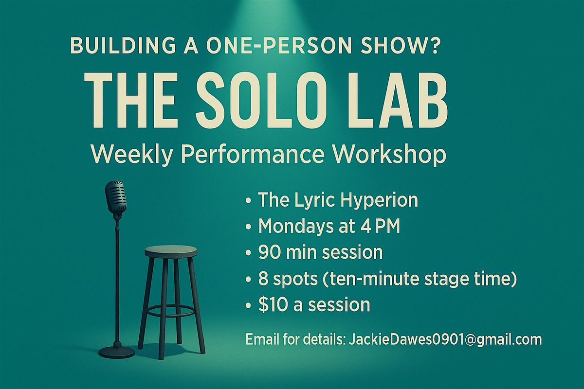 The Solo Lab is a weekly performance workshop designed for artists developing one-person shows, monologues, storytelling pieces, or any kind of solo theatrical work.