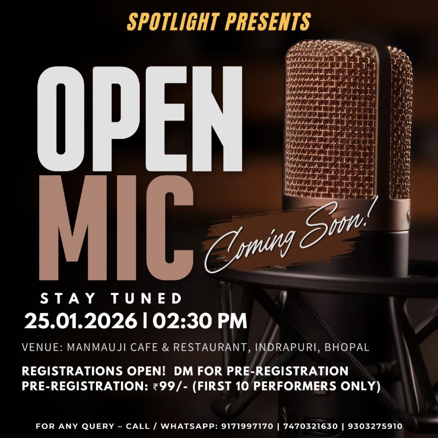 The Spotlight invites you to be a part of Open Mic Bhopal — an evening where poetry breathes, stories connect, music heals, comedy sparks laughter, and shayari touches souls.