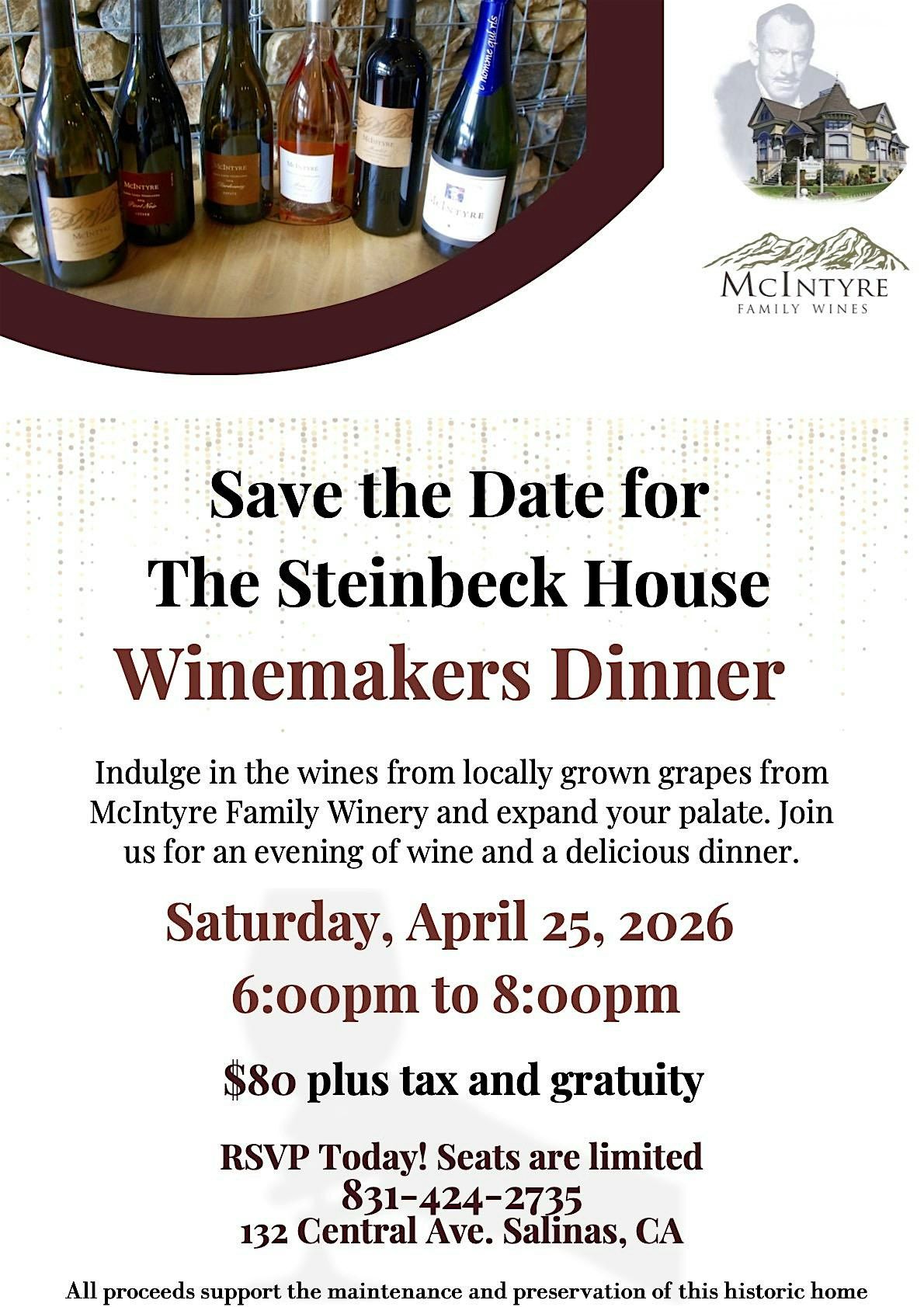 The Steinbeck House welcomes back McIntyre Family Winery for a special evening with wine tasting and delicious dinner. Join us for an evening of wine and food.