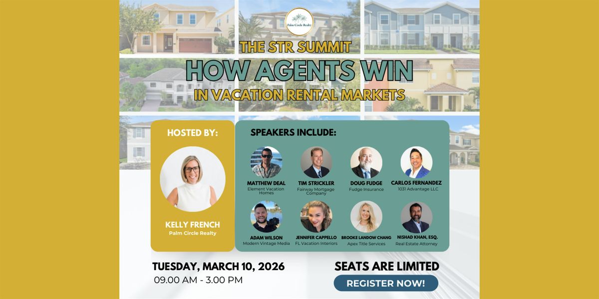 Join us on Tuesday, March 10th from 9am-3pm (location TBD- in Kissimmee/Davenport). Lunch will be served. This full-day, in-person training is designed for real estate agents who want to confidently sell short-term rental properties, attract investor clients, and stand out in vacation rental markets. You’ll learn how to evaluate STR deals, understand what investors actually care about, navigate common pitfalls, and speak with clarity and authority. This is not a webinar. It’s an immersive, practical experience with real-world strategies you can apply immediately. Space is limited to keep the room intentional and high-impact. If you want to win in vacation rental markets, this is the room you need to be in.