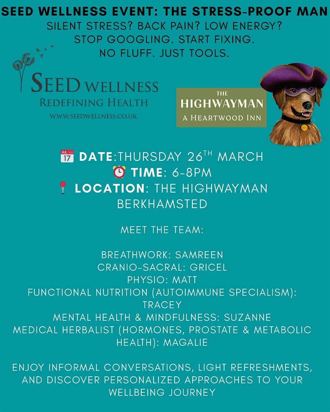 The Stress-Proof Man is not a lecture. It's a practical, no-nonsense evening of men's health, held in the relaxed setting of The Highwayman pub.