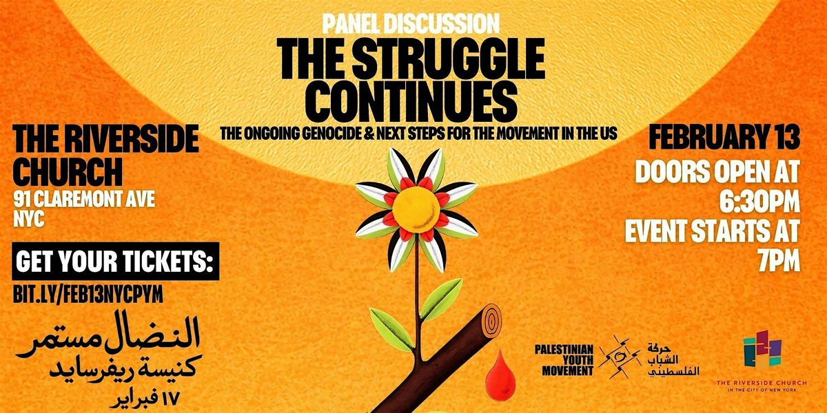 The Struggle Continues is a panel discussion designed to ground our movement in a clear analysis of the current state of the genocide, the political forces enabling it, and the growing movement for Palestinian liberation in the United States. Tickets are required. This event is free with the option of donating. All proceeds from the event will go towards the Middle East Children's Alliance (MECA) and their relief efforts in Gaza.