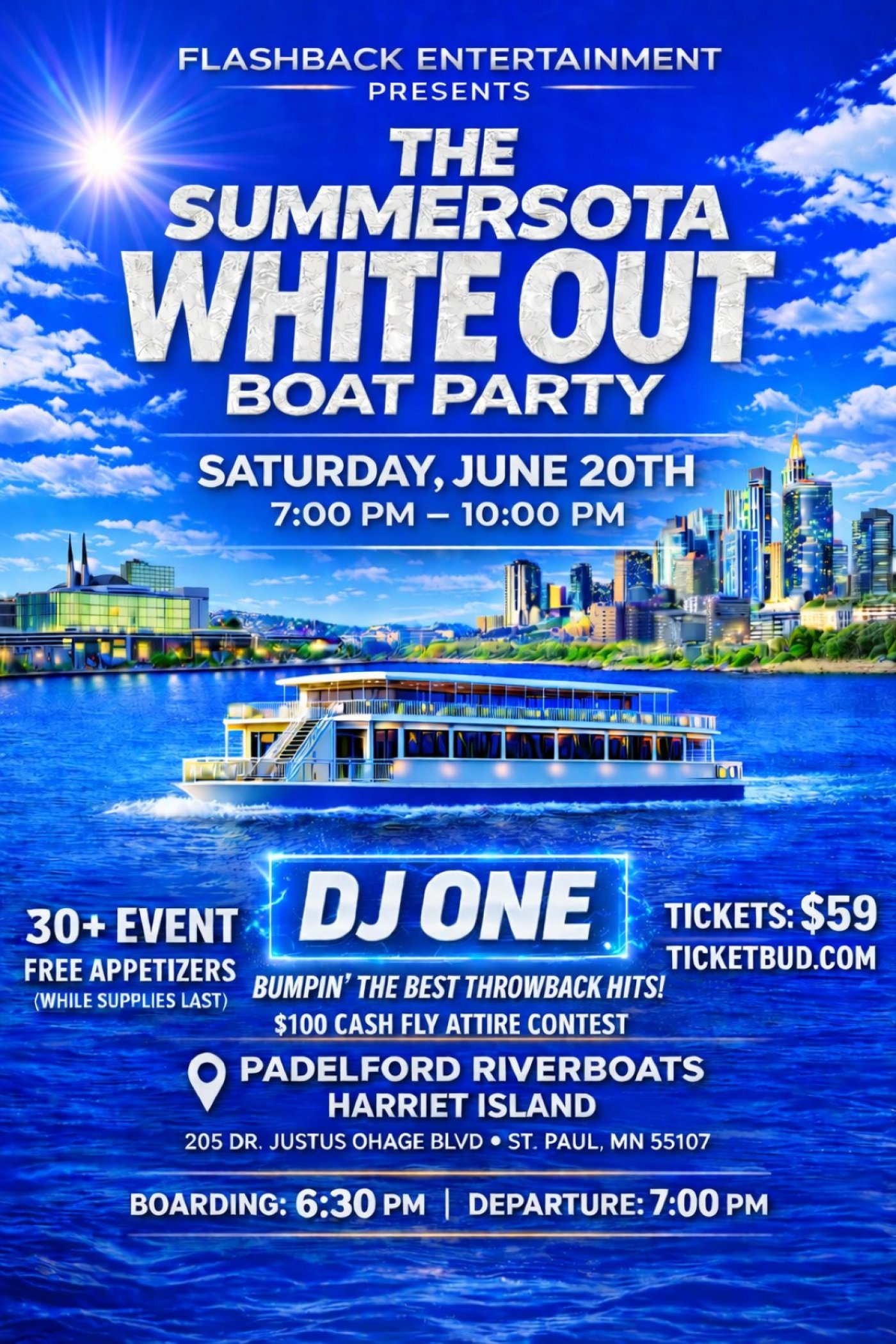 Come join us on the river for The Summersota White Out Boat Party. This is a 30+ grown and good vibes event with great people and lots of fun! The spin master DJ ONE will be rockin' all thee best throwback hits from the 80's-Y2K. We'll be giving away $100 cash in the best white attire outfits contest! A night of music reminisce,you don't want to miss!!