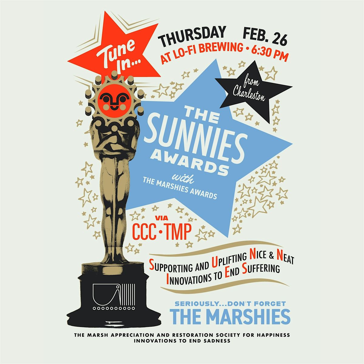 The Supporting and Uplifting Nice & Neat Innovations to End Suffering Awards (also known as The Sunnies) will go to some of Charleston's most creative and effective climate leaders, and the Marsh Appreciation and Restoration Society for Happiness Innovations to End Sadness Awards (also known as The Marshies) will go to local plant lovers, pollinator pals, and ecowarriors.