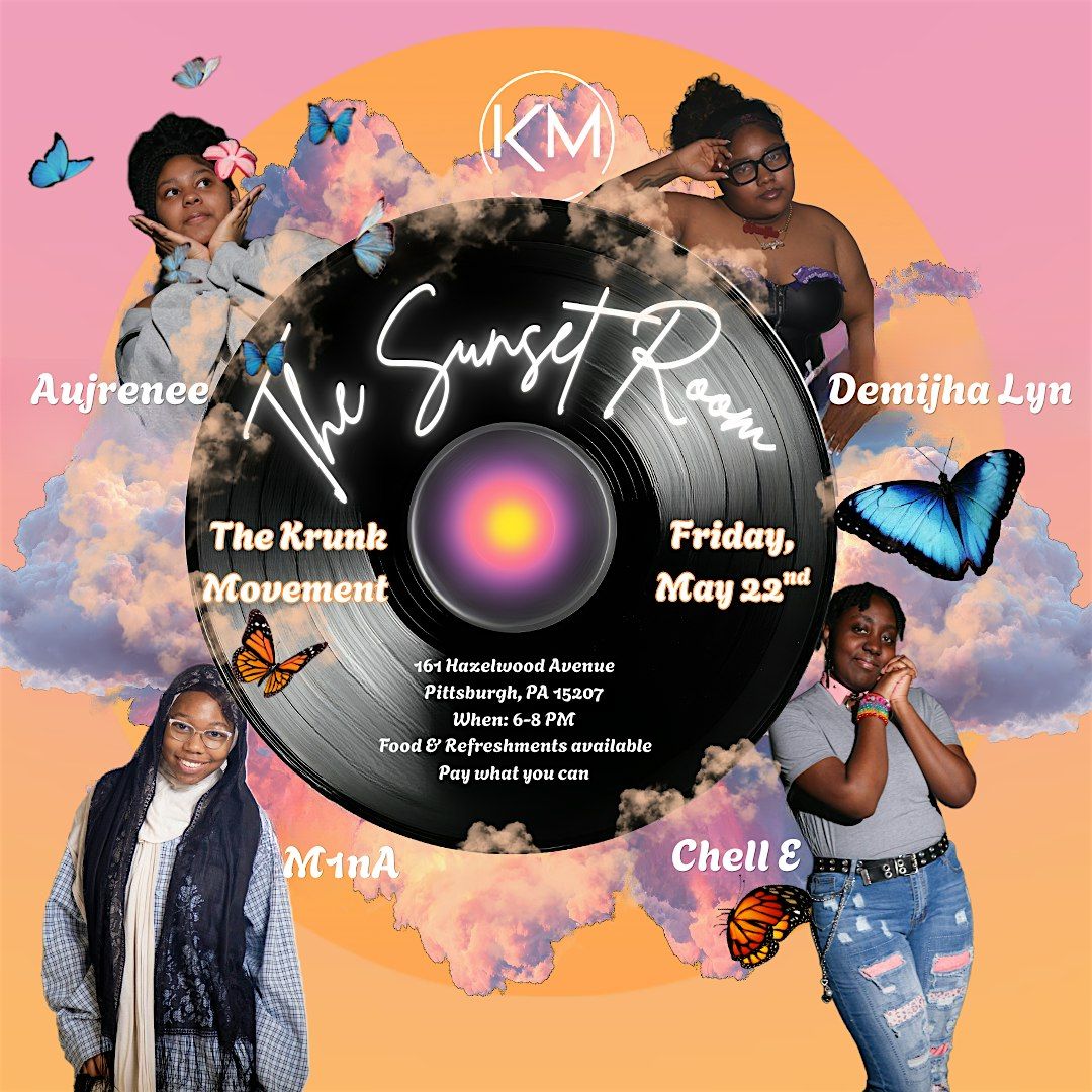 The Sunset Room is a live multi-genre showcase by The Krunk Movement in Pittsburgh featuring emerging artists performing original music, covers, and poetry. The night blends R&B, Pop, Alternative, Hip-hop, and Spoken Word into an immersive, emotional experience centered on storytelling and connection.