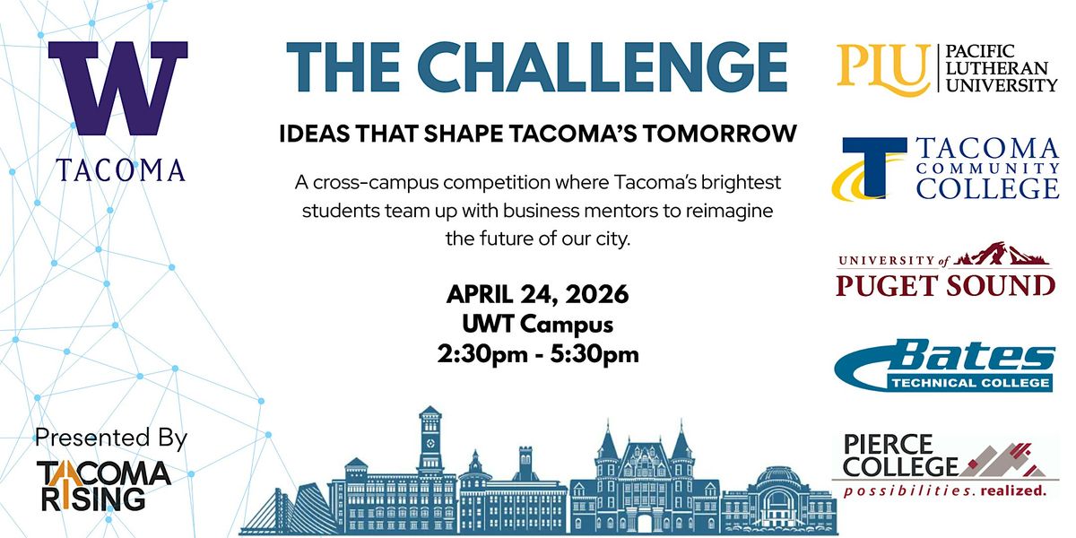Join us for the Tacoma Rising Challenge 2026, a high-energy, one-day design sprint connecting South Sound college students with professionals across Tacoma’s business, development, and civic sectors. This year’s focus: reimagining Pacific Avenue near the University of Washington Tacoma — a critical downtown gateway ready for revitalization.