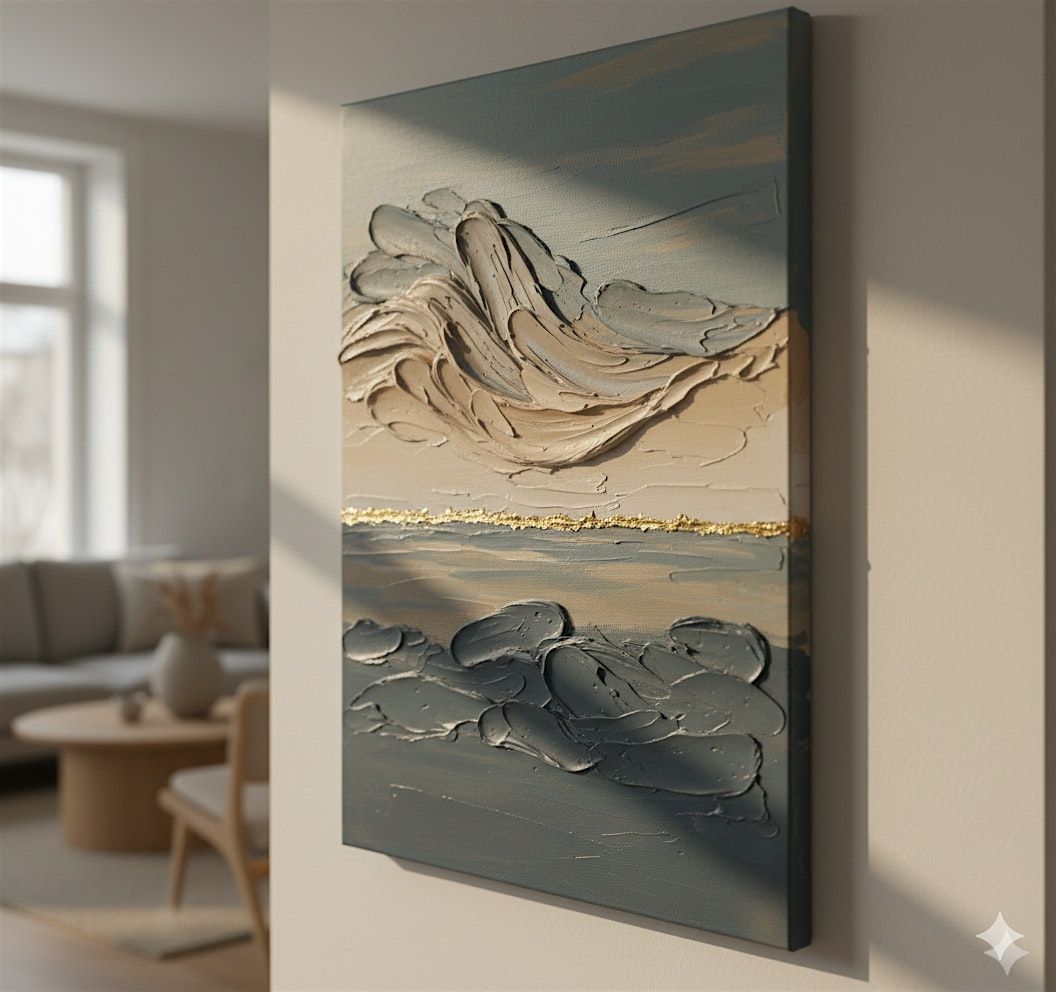 During this immersive and meditative session, you’ll trade traditional brushes for palette knives and sculptural tools, creating a stunning, gallery-style piece that feels straight out of a high-end studio. Using heavy-body modeling paste and professional palette knives, you will sculpt sweeping waves and organic ridges, building a tactile landscape of muted blues, sandy creams, and warm taupes.