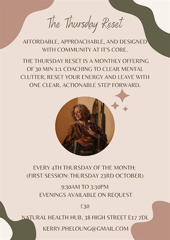 The Thursday Reset offers 30-minute in-person coaching sessions at the Natural Health Hub in Walthamstow designed to help you regain focus, clarity, and calm.