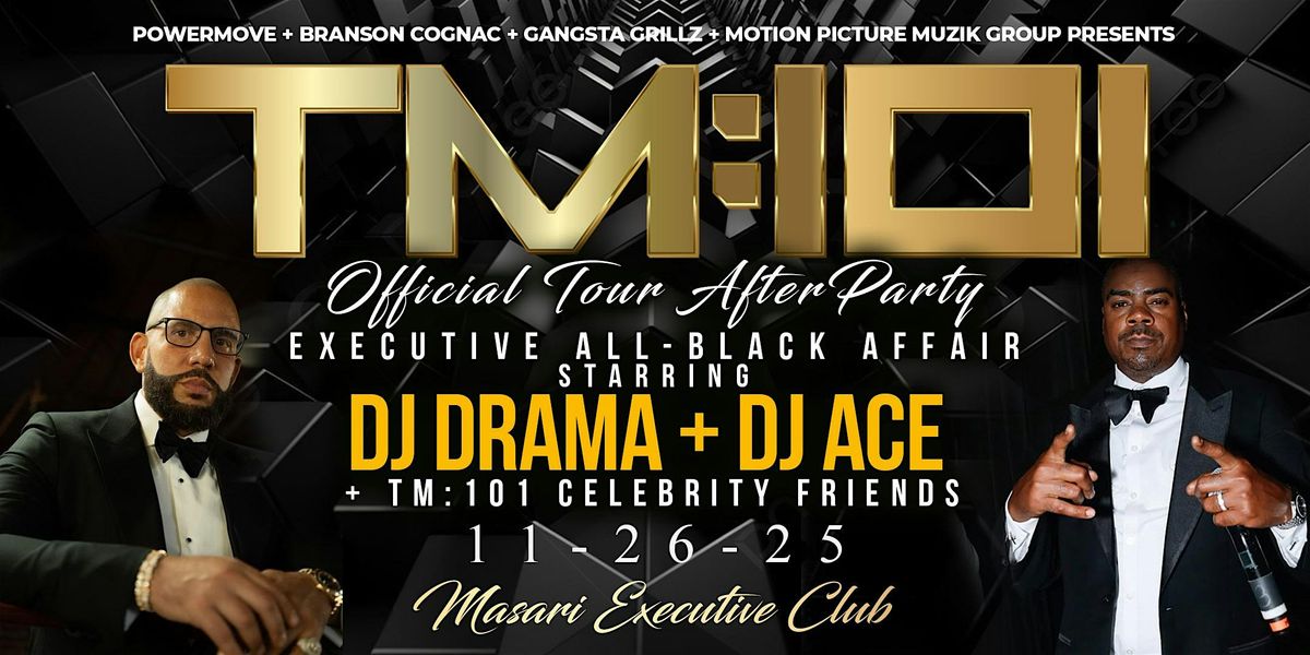 Join us at the TM:101 Official Concert All-Black VIP PARTY! Get ready to groove with Dj Drama & Dj Ace at Masari Gentleman's Club on November 26, 2025 at 9:00 PM (Eastern Time). It's going to beThe Greatest movie Ever filled with Huge Celebrity Guests, Over 101 Entertainers + VIP treatment. Don't miss out on this exclusive event!