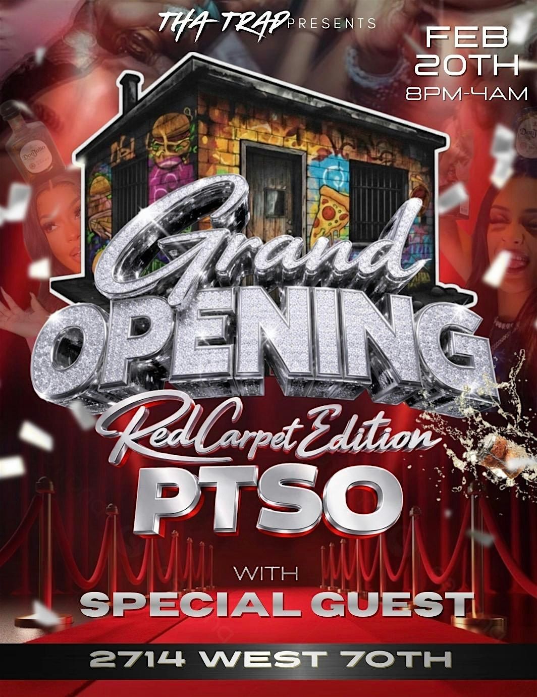 Grand Opening – Red Carpet EditionTha Trap presents its Grand Opening on February 20th, from 8PM–4AM, featuring a red-carpet PTSO vibe