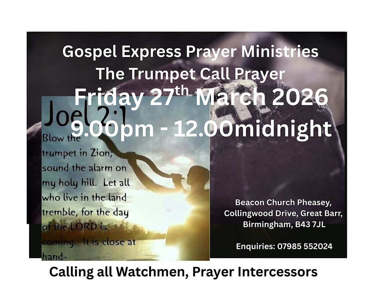 Join us at Beacon Church Pheasey for a special evening of prayer and community. We'll gather on March 27, 2026 at 9:00 PM (GMT) to lift our voices together in faith and hope. It’s a time to blow the Trumpet and call the nation to repentance