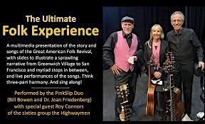 Travel back to the Great American Folk Music Revival with The Ultimate Folk Experience! The PinkSlip Duo (Joan Friedenberg and Bill Bowen) joins Roy Connors, former member of the 1960s folk group The Highwaymen, for a nostalgic journey through stories, slides, and beloved songs by Woody Guthrie, Pete Seeger, Joan Baez, Bob Dylan, and more. Enjoy rich harmonies, multiple instruments, and a lively sing-along celebrating America’s folk music legacy.