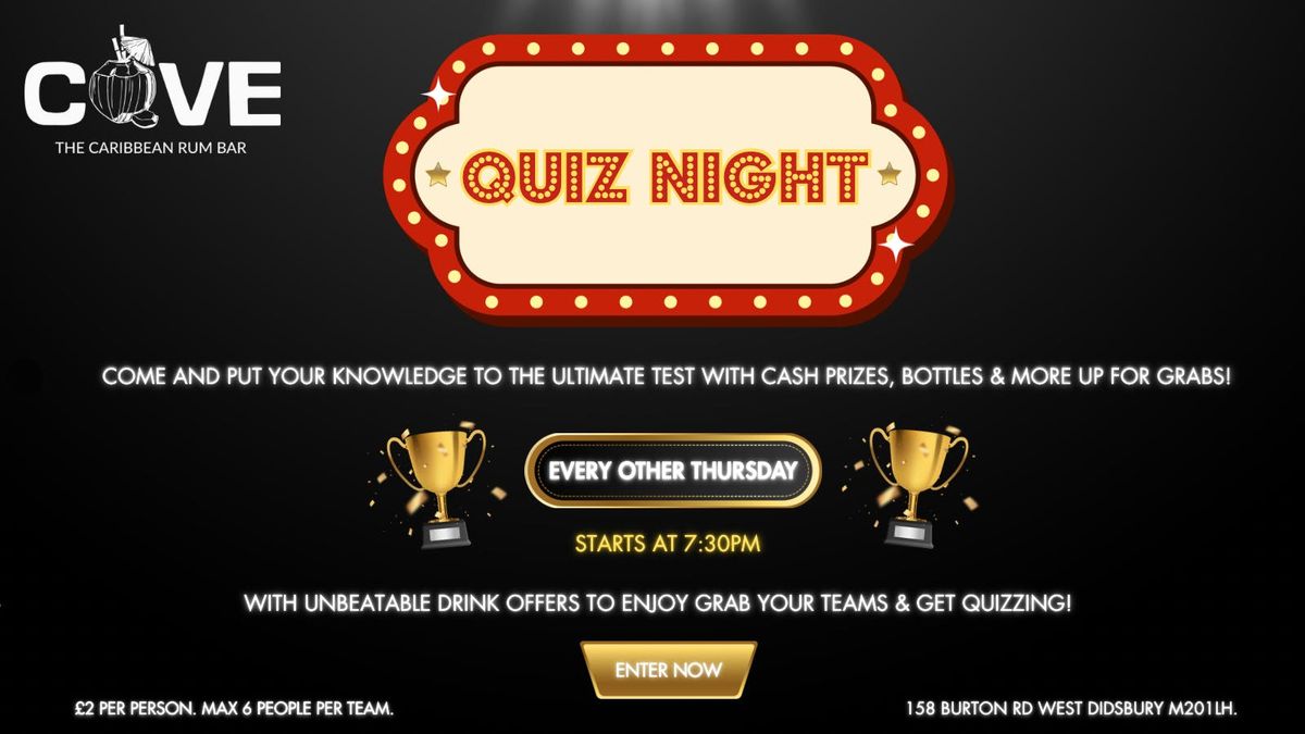 Each & every other Thursday prepare for a quiz like no other... 📅 Every other Thursday⏰ Time: 7:30 PM📍 Location: Cove, 158 Burton Rd, West Didsbury M20 1LH.