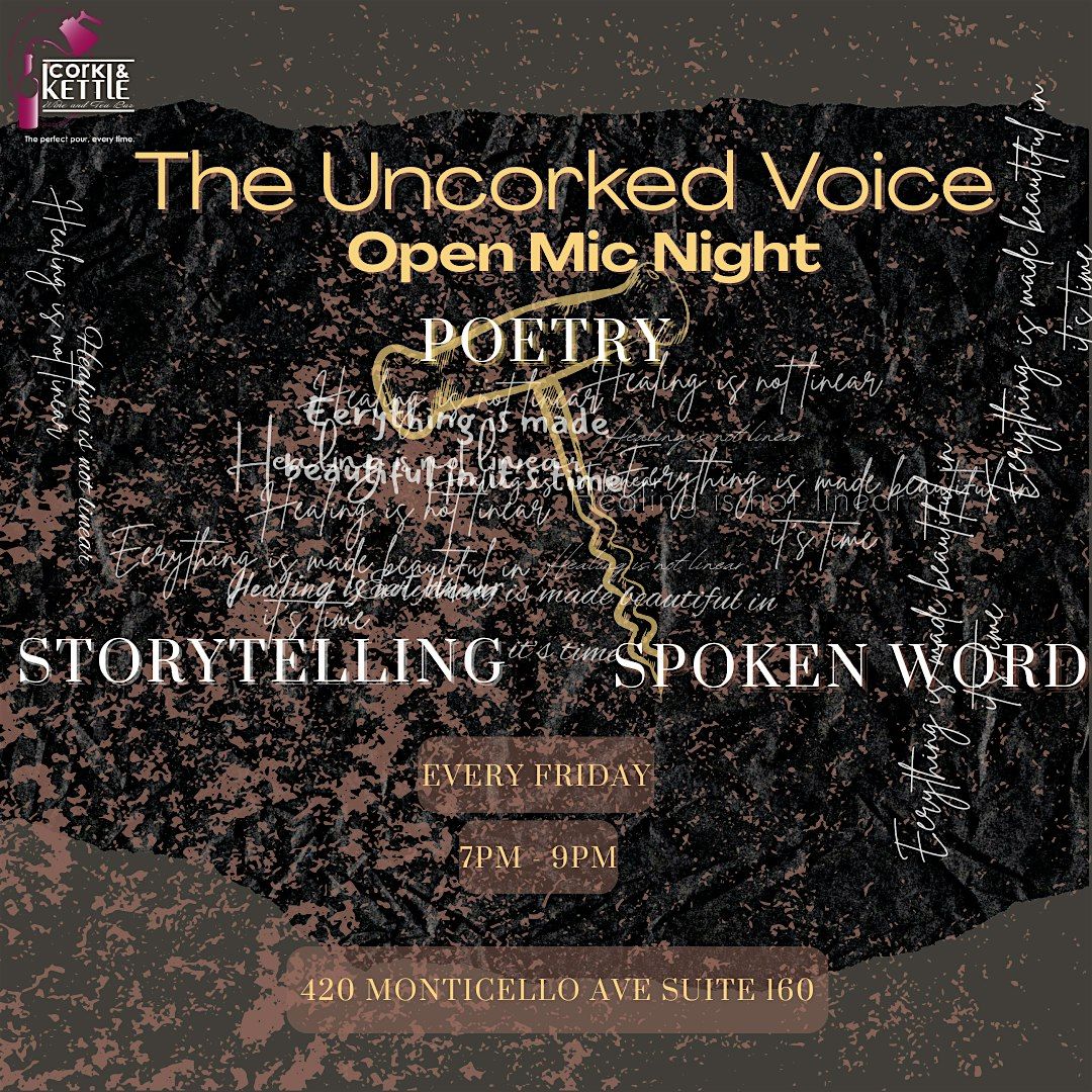 Welcome to The Uncorked Voice - an event where voices are set loose! Join us for a night of unlimited laughter, melodic tunes, and heartfelt poetry. Let your inhibitions go and uncork your inner artist with our interactive sessions and live performances. This in-person gathering is your chance to shine, whether you're a seasoned performer or a first-timer. Embrace the spotlight, share your talent, or simply bask in the creative energy. Mark your calendar and get ready to unleash your voice.