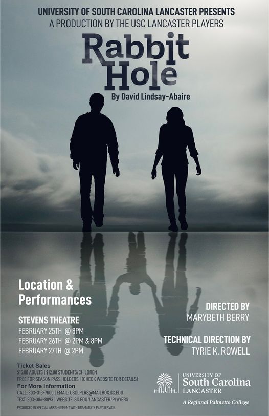 The USC Lancaster Players will present "Rabbit Hole" on February 25 at 8:00 pm, February 26 at 2:00 & 8:00 pm, and February 27 at 2:00 pm in Stevens Theatre. Tickets can be purchased at https://bit.ly/3EkyPIE - $15 adults, $12 students/children. For more information, call 803-313-7000, text 803-386-8893, or email [email protected].