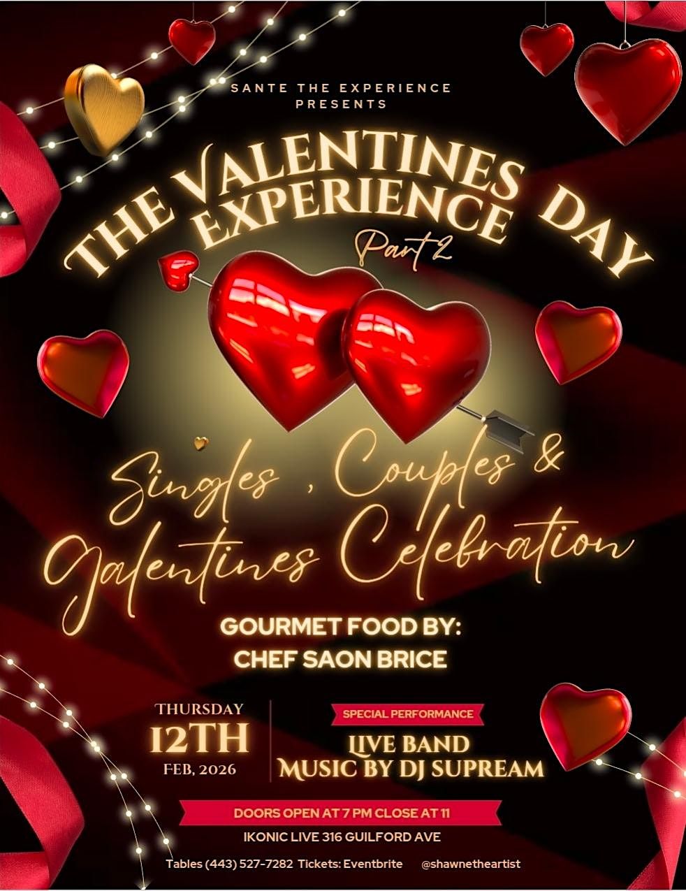 A perfect way to have an elevated experience for Valentines Day! Singles mingle, private tables for couples, Large sections For group dates to be serenaded by a live band with Special Performance. Tables for purchase at 4435277282. The best gourmet food by celebrity chef Saon Brice of Holy Môlï Food Truck. A memorable Experienc.