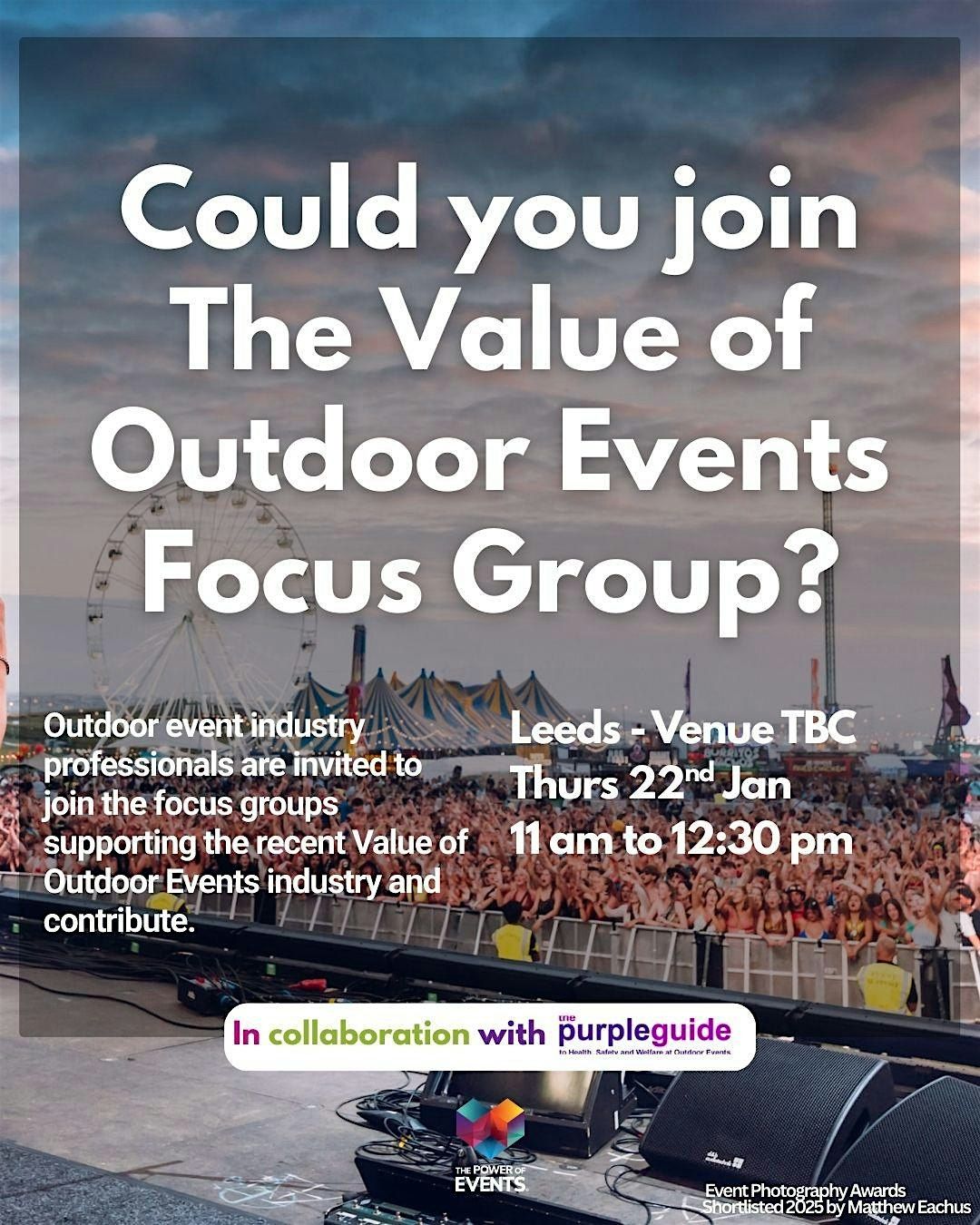 Join us and participate in a focus group for the EIF “Value of Outdoor Events” Research Project, a major national study funded by the Purple Guide and the Events Industry Forum and delivered in partnership with The Power of Events.