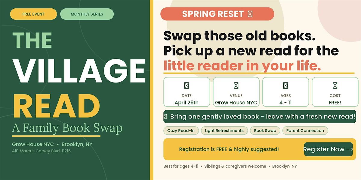 Join us for The Village Read, a free monthly gathering where Brooklyn families come together to read, swap books, and connect. Dig out a gently loved book your little one has outgrown, bring it along, and trade it for a fresh new read to kick off the season. While the kids settle in for a cozy read-in, parents get a moment to breathe, snack, and meet other families in the neighborhood.