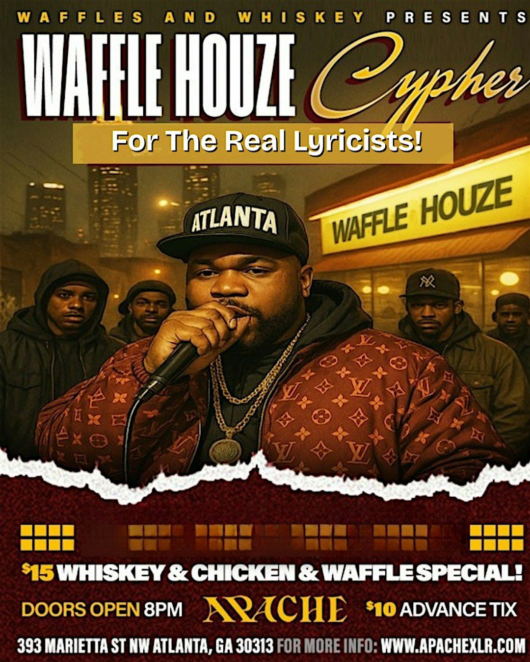 Join us Wednesday, Jan 21st , for The Waffle Houze Cypher Open Mic at Apache XLR. Come experience the hottest MC's in the city battle it out for the crown, $15 chicken & waffle + shot special, hookah specials, and of course great vibes. Get ready to see which hip hop artists has the best bars. No ghostwriters allowed!