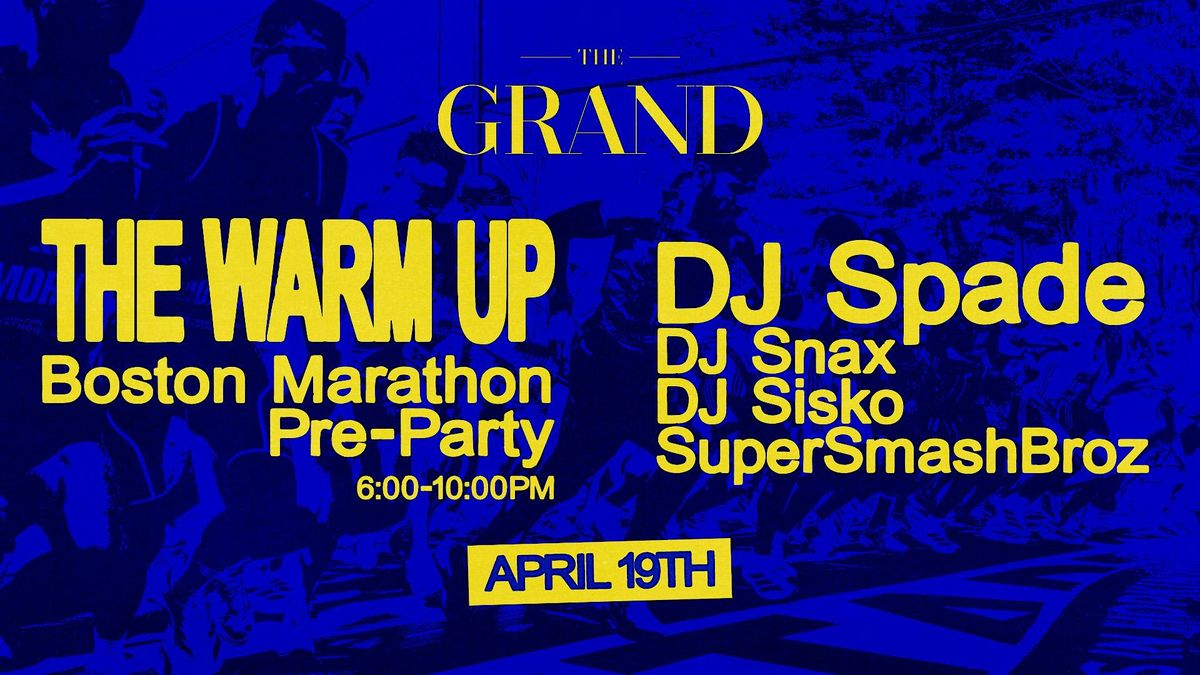 The Warm Up: The Boston Marathon Preparty at The Grand, 6–10 PM. The official day party to kick off Marathon weekend in Boston. Expect a high-energy mix of hip hop, Latin, and afrobeats all afternoon.
